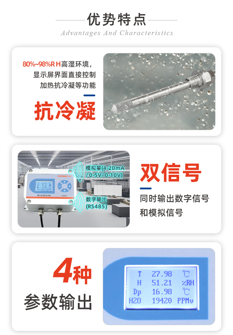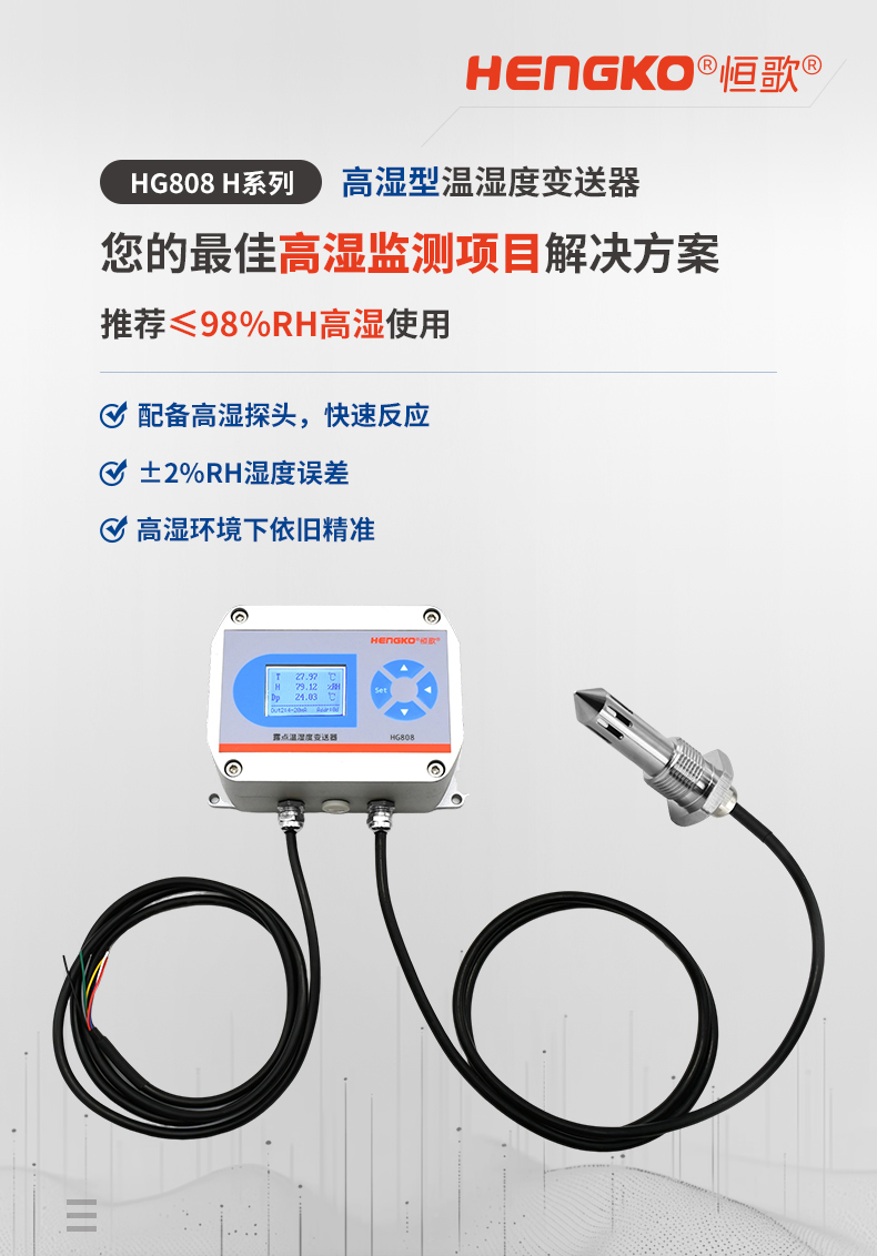 HG808-H系列是一款專業應對工業高濕環境而研發設計的高精度溫濕度變送器。具有長期穩定的高精度濕度感知能力和優秀的耐腐蝕能力,配有堅固的鑄鋁外殼和不銹鋼傳感器組件,其最高濕度范圍可達98%RH,確保在食品催熟發酵干燥、煙廠、燃氣機管道、溫室培育、電廠、壓力蒸汽等工業高濕(相對濕度80%RH~95%RH之間)的工業環境中可持續精確地檢測溫度和濕度。